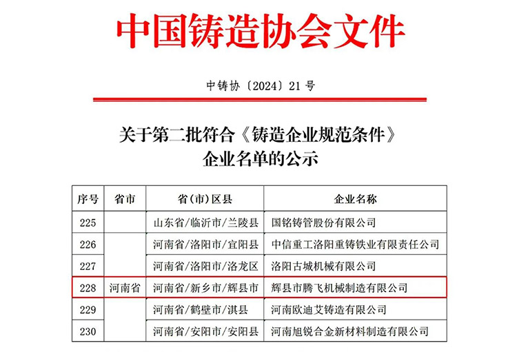 9月11日,中國鑄造協(xié)會官網(wǎng)公示了“第二批符合《鑄造企業(yè)規(guī)范條件》企業(yè)名單”,輝縣市騰飛機械制造有限公司榮登榜單。