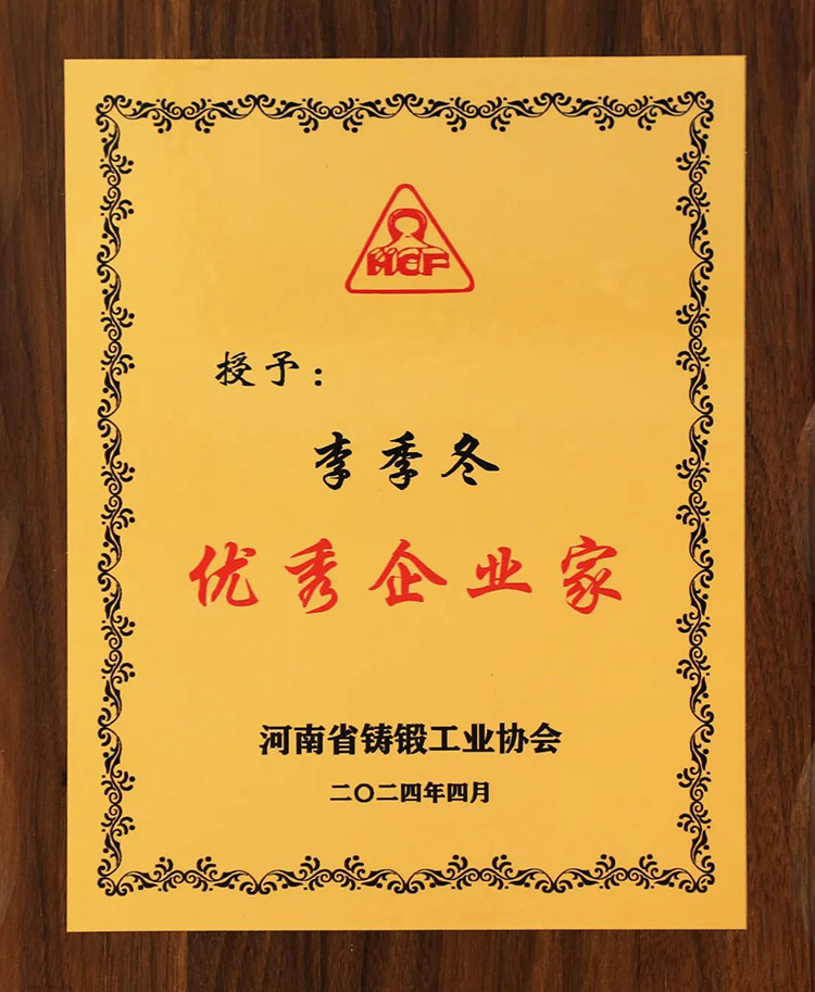 在河南省鑄鍛工業(yè)年會上,公司領(lǐng)導(dǎo)李總被授予“優(yōu) 秀企業(yè)家”稱號。